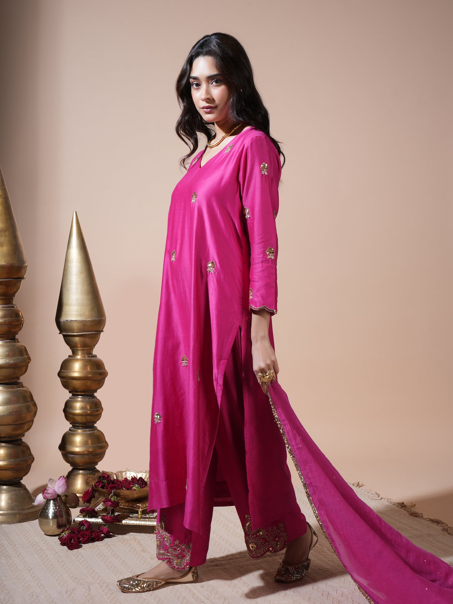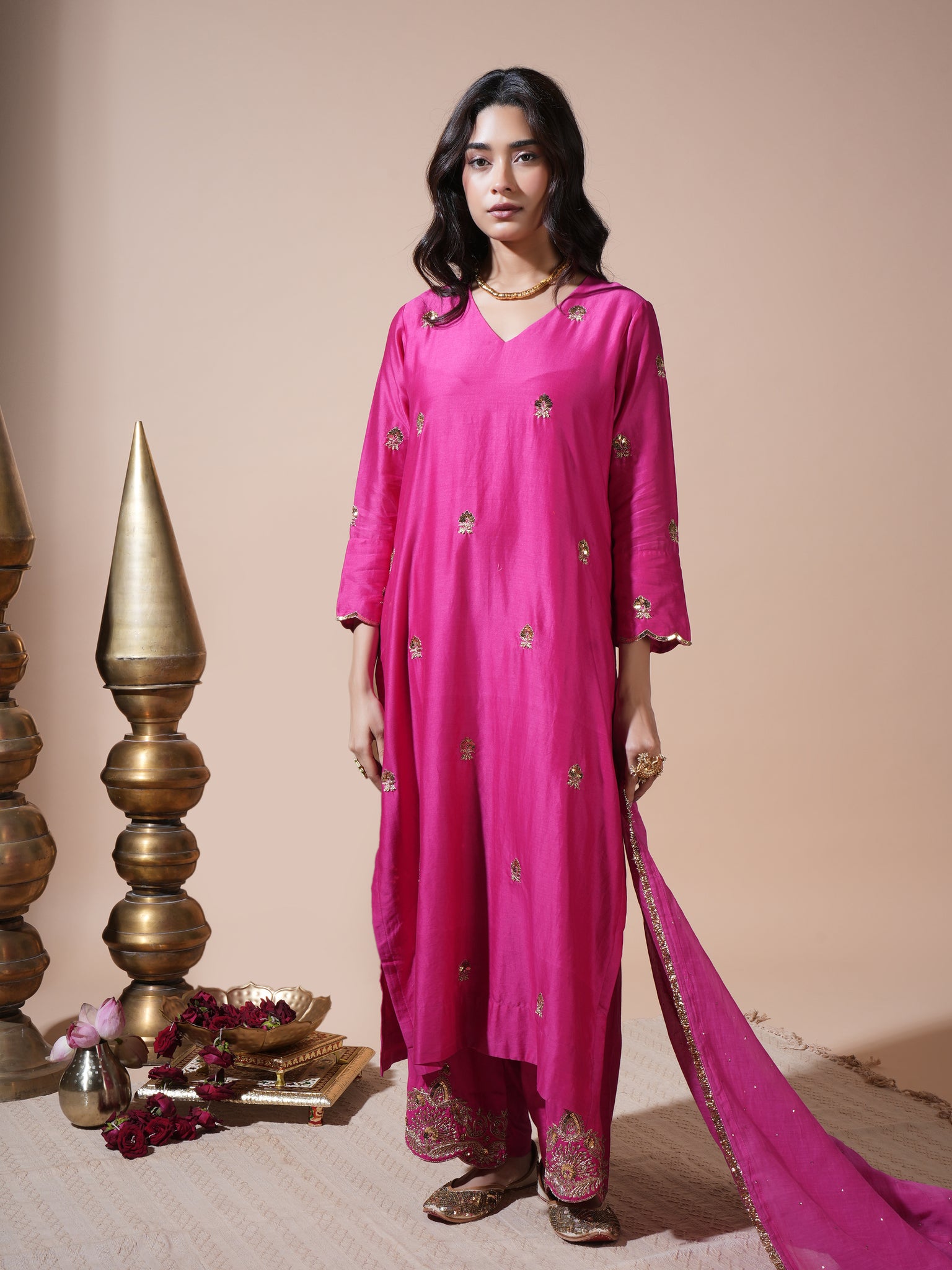 Crafted from luxurious Chanderi fabric, this Pink Mor Straight Kurta Set showcases a timeless long silhouette enhanced by exquisite mor (peacock) hand embroidery. It features matching pants adorned with intricate heavy hand floral embroidery and a coordinating dupatta embellished with delicate badla/mukeish handwork. Perfectly suited for festive occasions, this ensemble combines traditional craftsmanship with elegant design to offer a refined and graceful look.